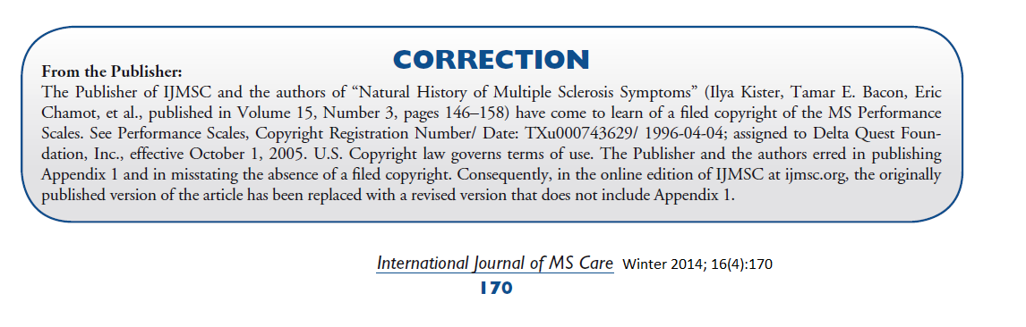The Performance Scales ©, Registration Number / Date: TXu000743629 / 1996-04-04, Date of Creation: 1993, is a long time Registered Copyrighted Work owned by DeltaQuest Foundation, Inc. The DeltaQuest Foundation website publicly lists this copyrighted work in a grouping of its copyrighted works [e.g. see http://www.deltaquest.org/pages/tools.html for a general description of such DeltaQuest measures and http://www.deltaquest.org/pages/perQOL.php#disease for specific listing in group of disease specific measures]. DeltaQuest Foundation, Inc. has sole ownership rights to reproduce the Performance Scales © in copies, including any electronically published, displayed or accessible digital form, (unless express permission has been granted by DeltaQuest Foundation, Inc.) and to all derivative works of the Performance Scales ©, including, without limitation, any work created therefrom or based thereon, such as any work employing the Performance Scales © as preexisting materials, any translation of the Performance Scales ©, or any other form in which the preexisting materials of the Performance Scales © has been recast, edited in revised form, modified, transformed or otherwise adapted into a work(s) derived therefrom. Below are errata issued due to violations of the U.S. Copyright protections (Title 17 of the United States Code) that encompass a grouping of exclusive protection rights which the owner of a copyrighted work is entitled to in the United States under its Copyright Act and in all other Berne Convention member countries. Any organization or individual who has downloaded a copy of the Performance Scales © from the NARCOMS.org website, such as by using their PS/PDDS Use Letter link (now deactivated), shall contact DeltaQuest Foundation, Inc. to arrange for a user license.